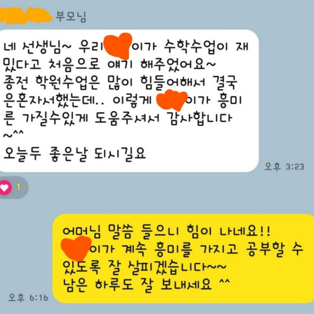 수학 문제를 마주했을 때 한숨 쉬던 아이가, 이제는 직접 풀이 과정을 설명하기도 하고, "선생님이 알려주신 방식으로 풀면 더 쉬워요!"라고 말하더군요. 점점 수학에 대한 자신감을 되찾고 있고, 최근에는 중간고사에서 20점 이상 오른 성적을 받아왔습니다.